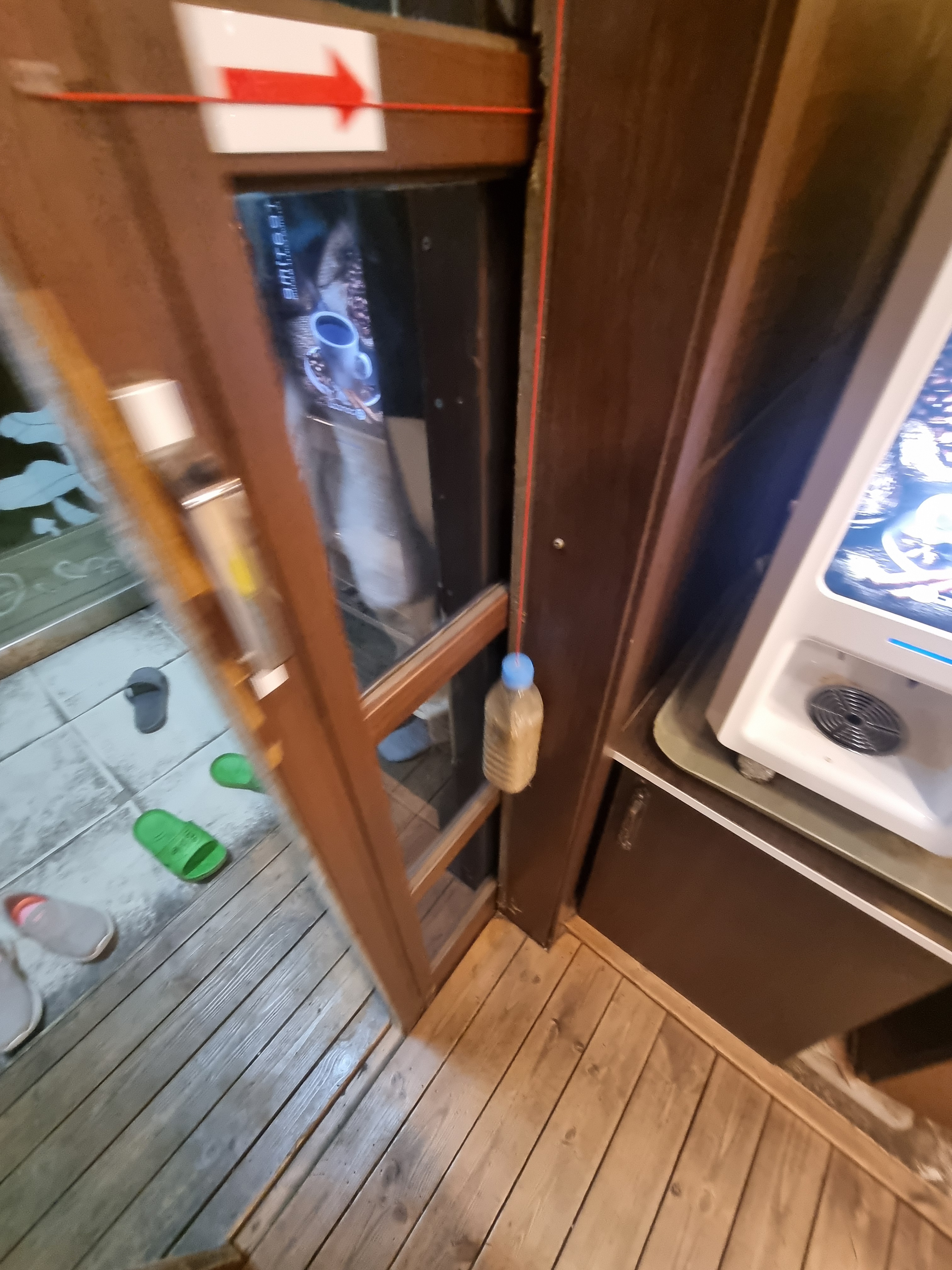뒤돌아 보니 이렇게 물통 모래추를 달아놔서 자동으로 문이 닫히게 만들어 놓으셨더라고요