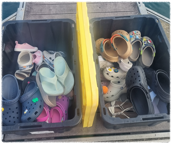 탑승 전 배 앞에 있는 상자에 이렇게 신고 온 슬리퍼, 신발들을 벗어두어야 했어요