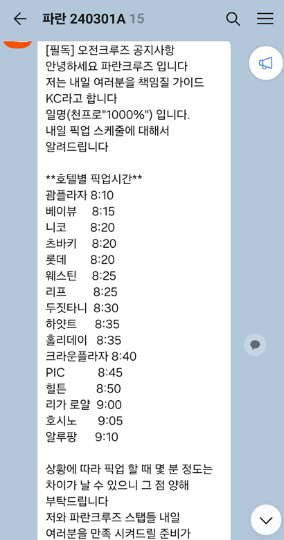 투어 전날에 이렇게 단톡방에 신청자분들을 초대하여 픽업 시간 및 투어에 대한 안내 메시지를 줍니다