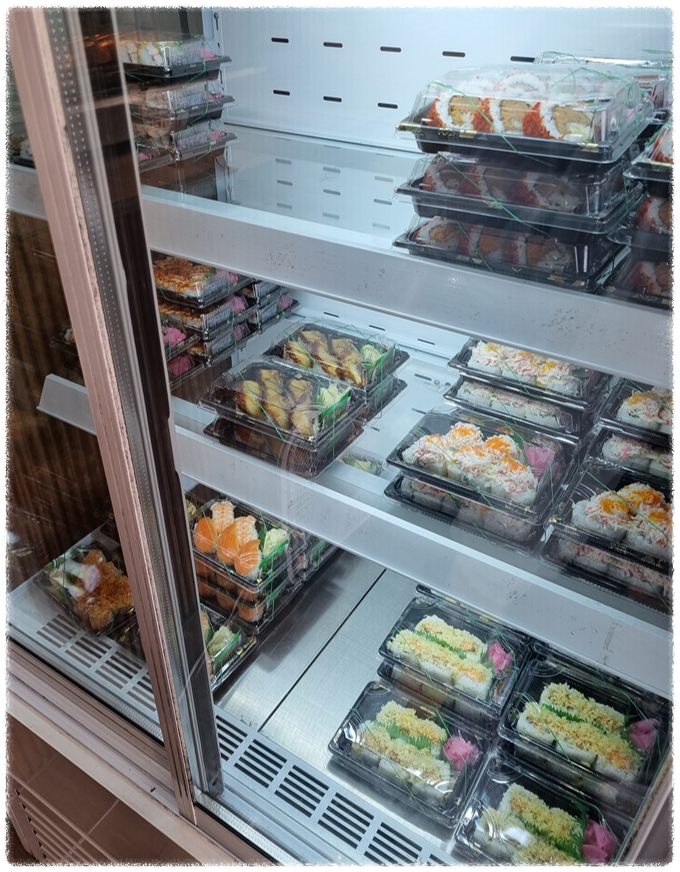 바로 옆 냉장고에는 여러 가지 맛의 스시롤들과 김치도 판매하고 있습니다