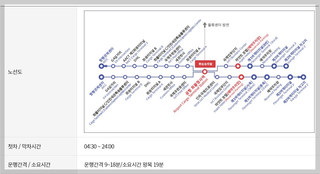 [제1 터미널 예약주차장 셔틀버스 노선도 및 운행 시간]