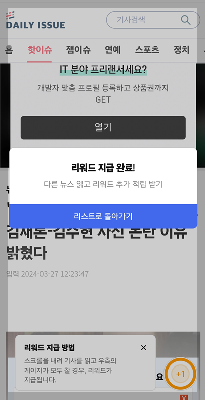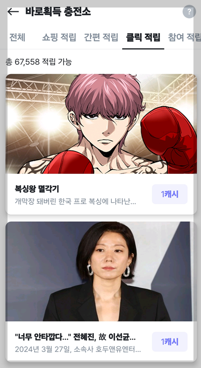 클릭 적립은 보통 뉴스를 들어가서 한 번만 화면을 움직이면 10초 후에 1 캐시를 받습니다