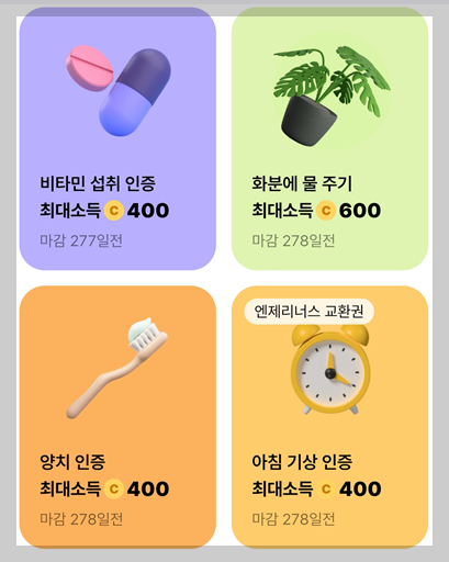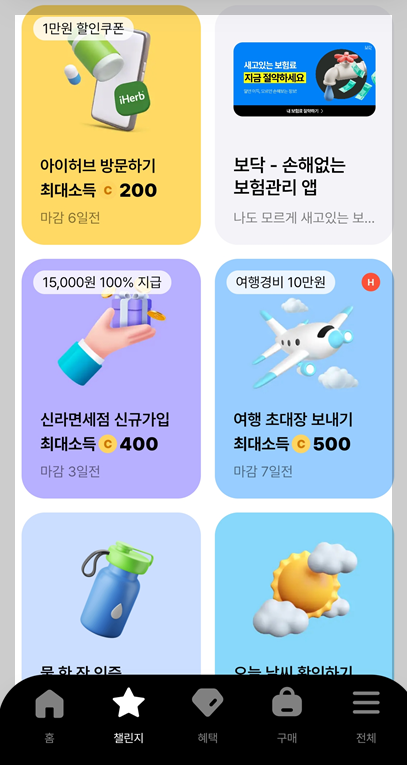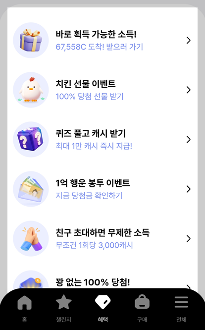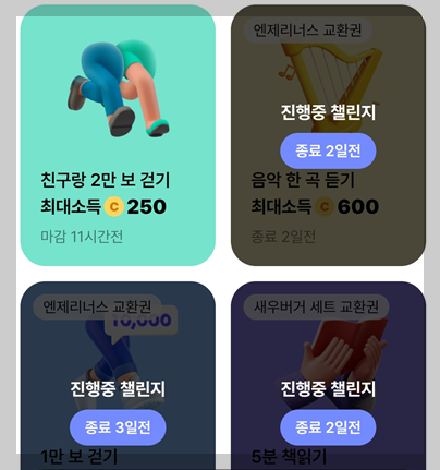 하단 '챌린지' 버튼을 누르면 실행할 수 있는 다양한 도전 목록들을 볼 수 있습니다