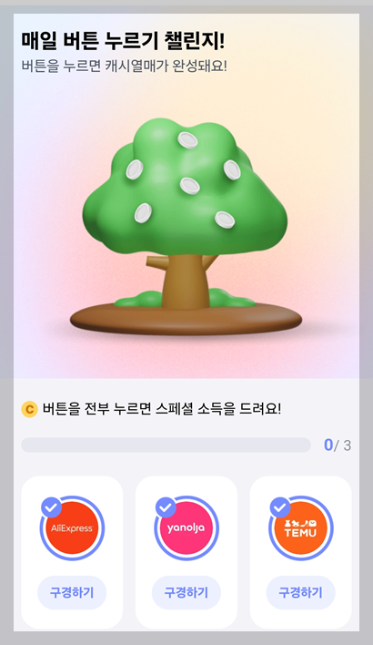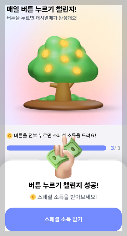 그리고 매일 버튼 누르기에서 각각 1 캐시씩 총 3 캐시를 받고