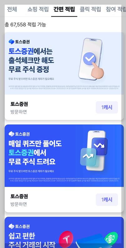 다음과 같이 간편 적립과 클릭 적립을 할 수 있습니다