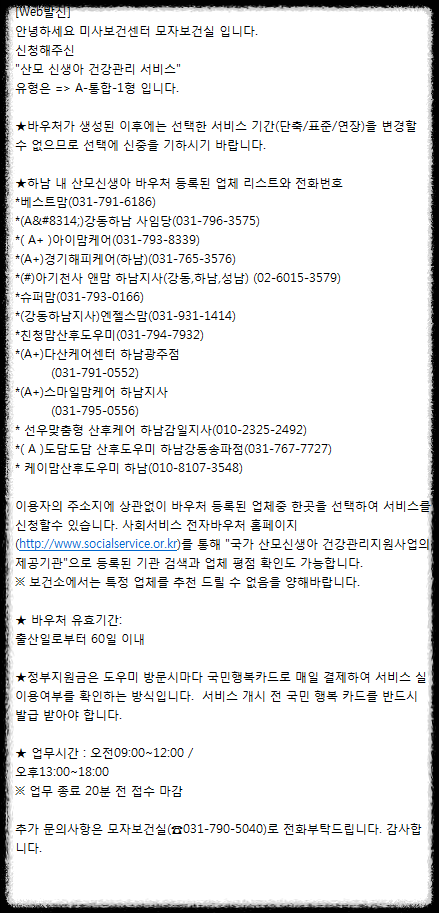 개별적으로 산후도우미 업체를 찾아서 연락하는 것이기 때문에 따로 신청 기간이 정해져 있지 않음