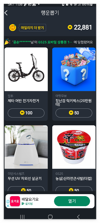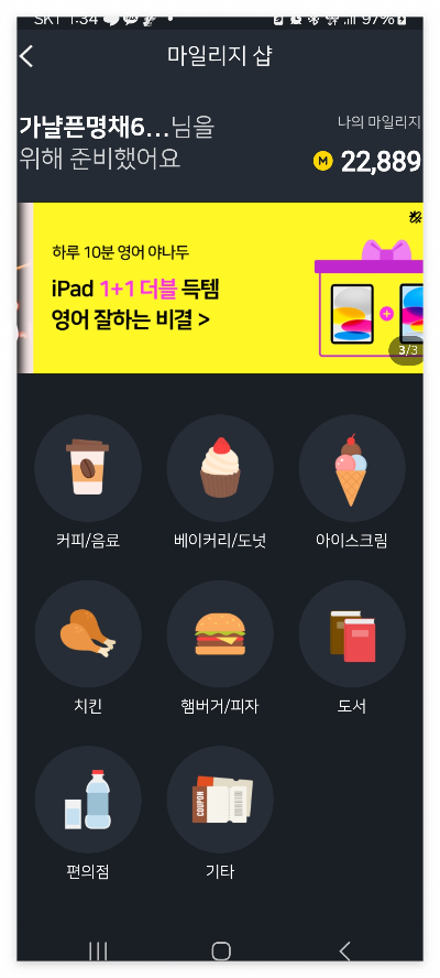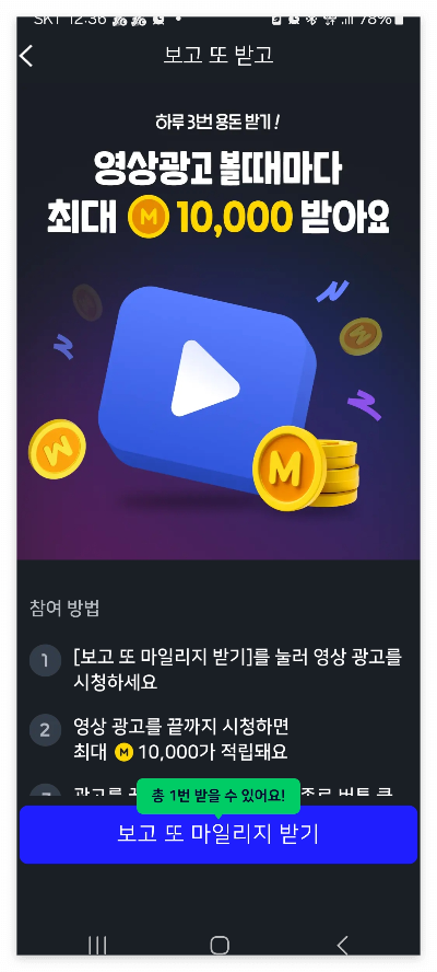 하루 총 3번 약 30초 광고를 보고 마일리지 받기