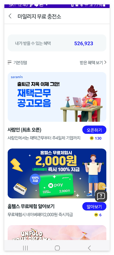 걸을 때마다, 클릭할 때마다 현금처럼 쓸 수 있는 마일리지가 쌓여요 매일 최대 37,730+ 마일리지 받는 야핏무브 100% 활용해보세요 -새로 오픈했어요- [출석하기] : 접속만 해도 매일 마일리지 드