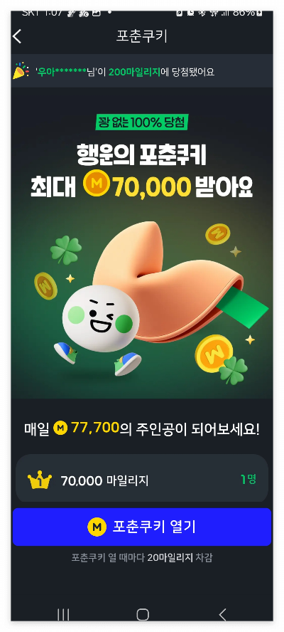포춘 쿠키 1회당 20 마일리지씩 주고 100여 번 돌려본 결과~