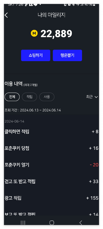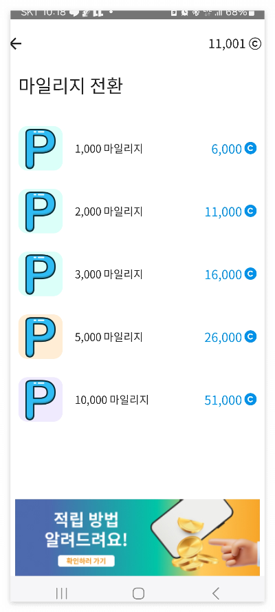 대충 한 달 총 6,000 코인 모은 후 마일리지 전환 시