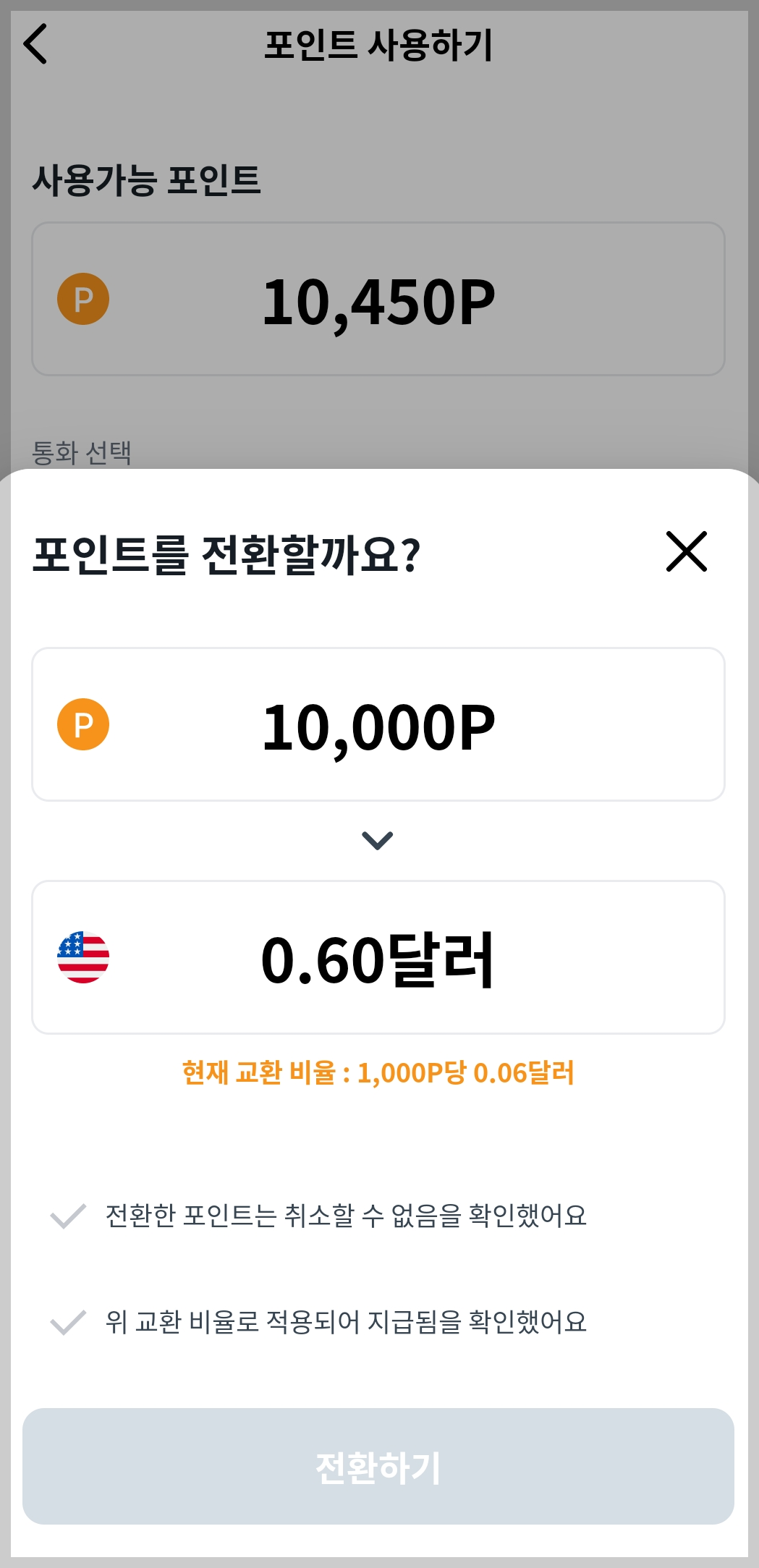 현재 환율로는 1만 포인트 = 0.6달러 환전이 가능한데요