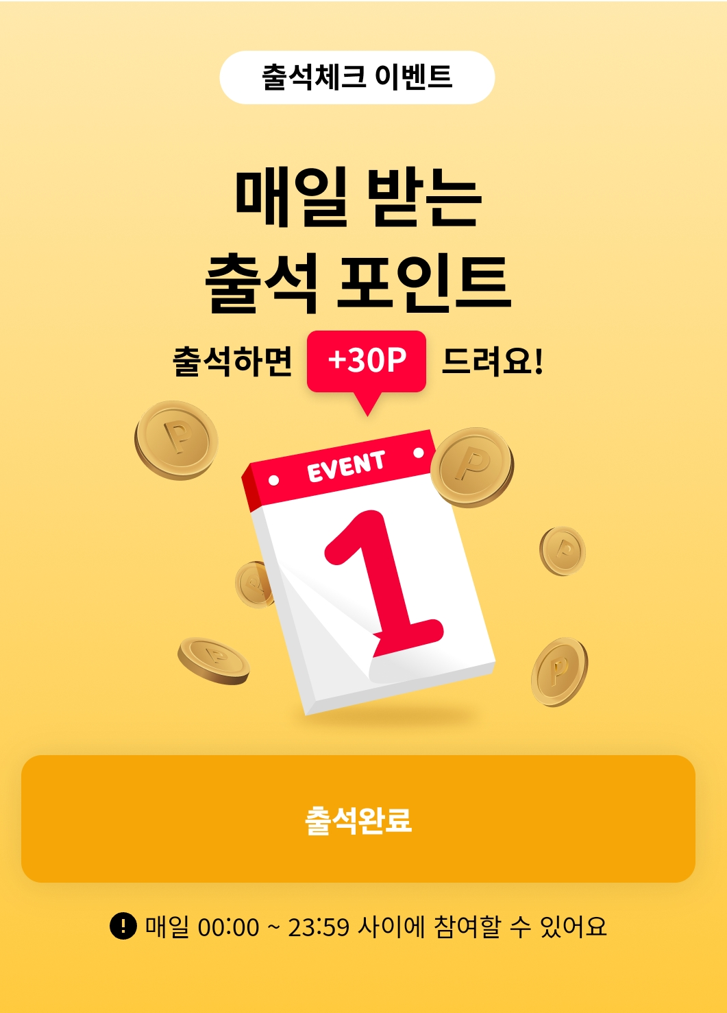 매일 아래와 같이 출석체크 버튼을 누르면 바로바로 적립돼요