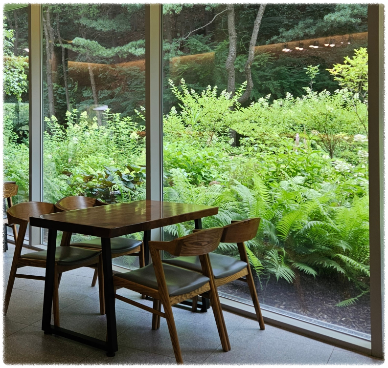 유리창을 통해 숲 속에 있는 느낌을 주는 카페