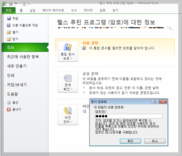 확인 후 동일 이름으로 다시 저장하면 비번이 해제됩니다