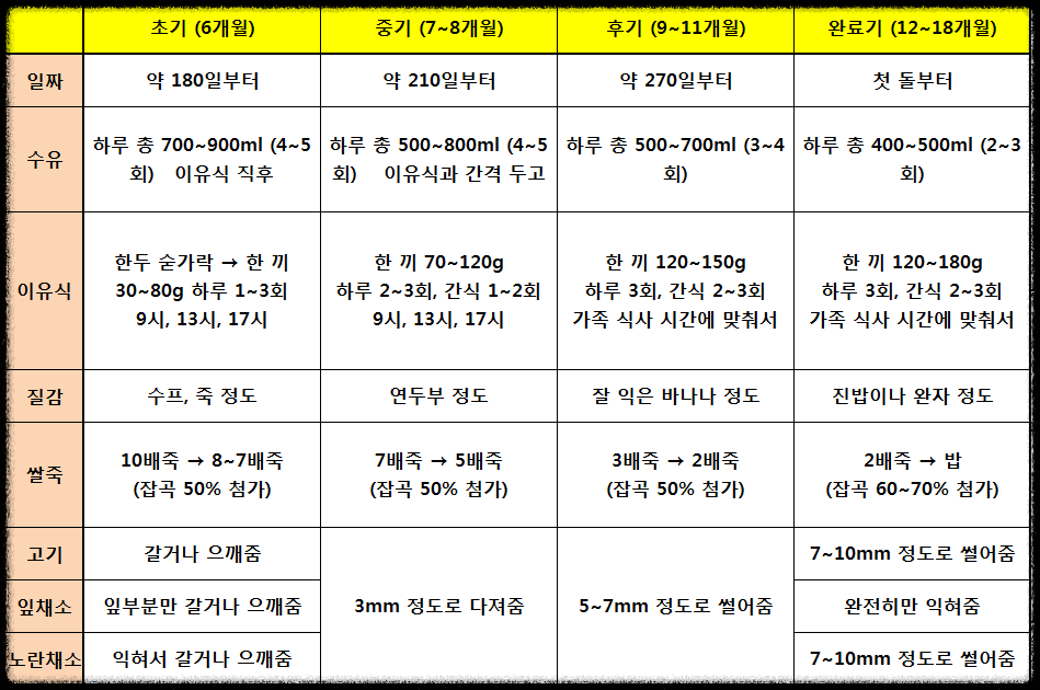 (보통 2돌 전에는 이유식 완료하고, 성인식으로 넘어감)