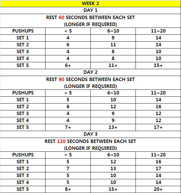 In week 2, increase the number of reps, gradually increasing the rest time between sets each day.