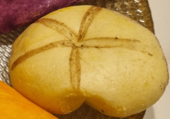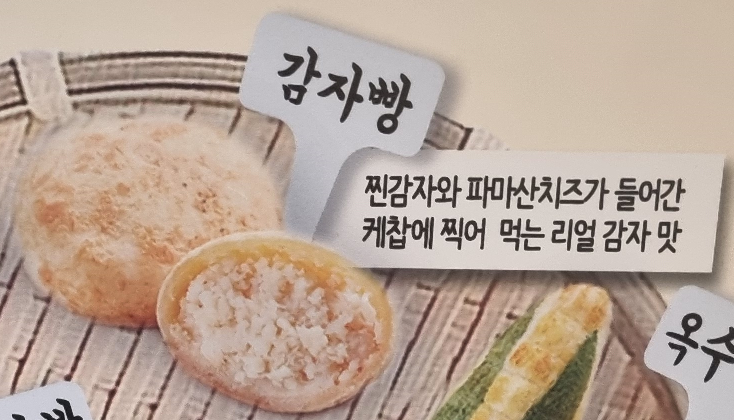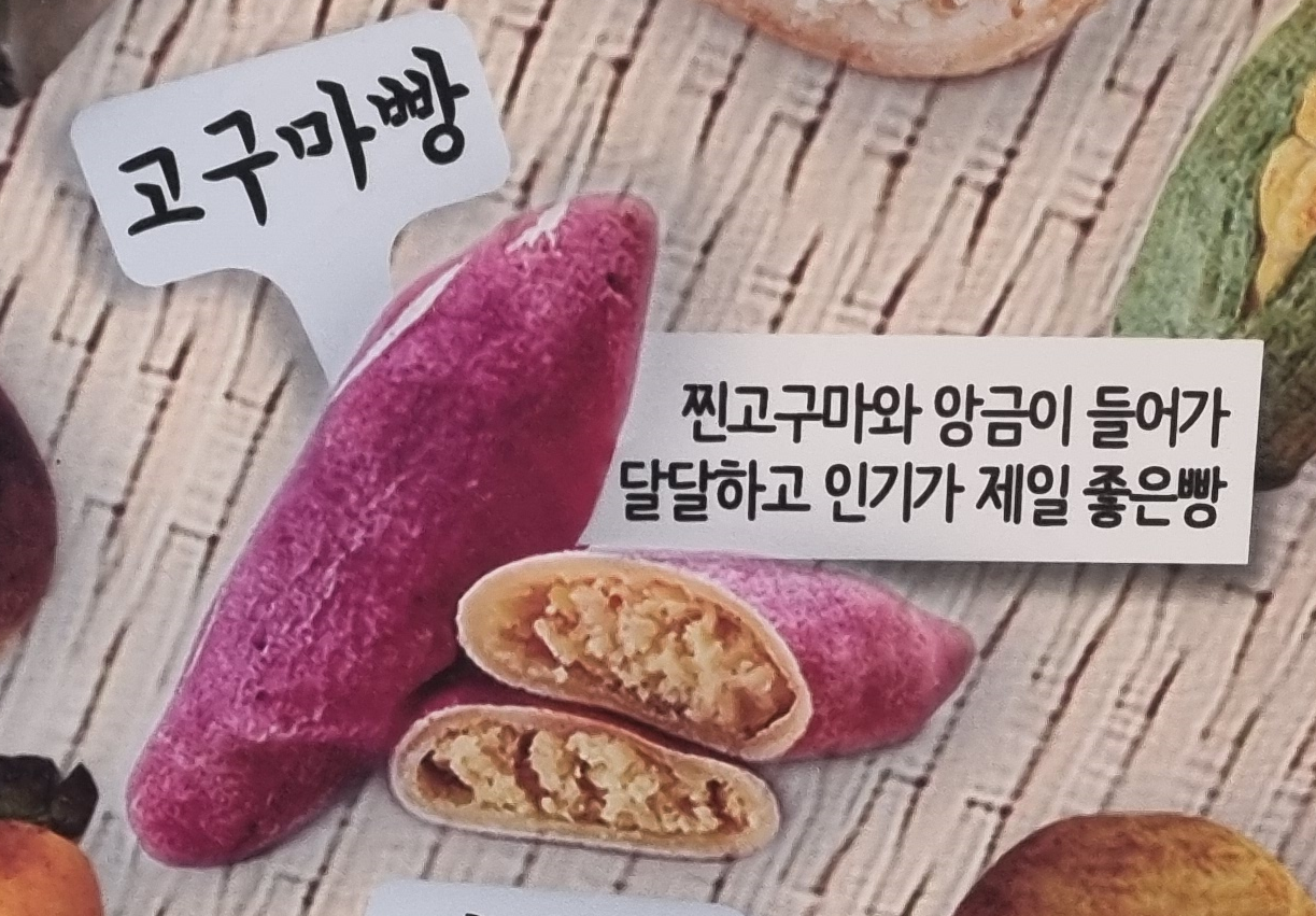 겉반죽을 찹쌀가루로 만들어 쫀득하고, 모양대로 구황작물맛이 나는 빵이라고 해요~