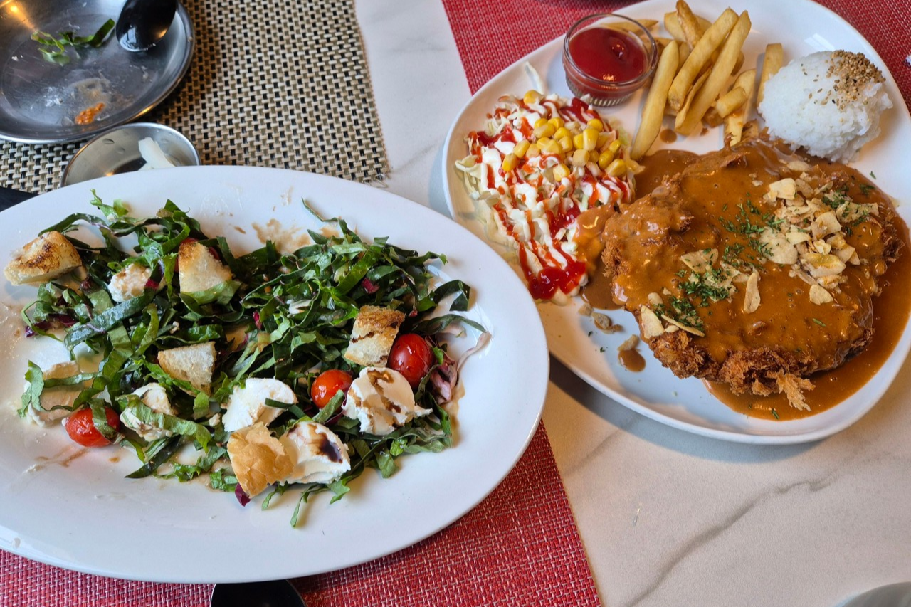 빠네 파스타(크림+청양고추+네모난 빵), 쉬림프 로제 리소토, 콤보 스테이크 플래터