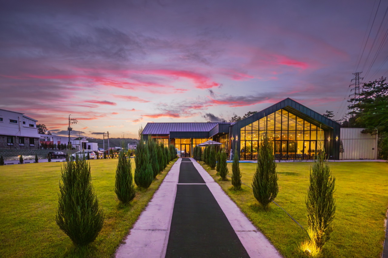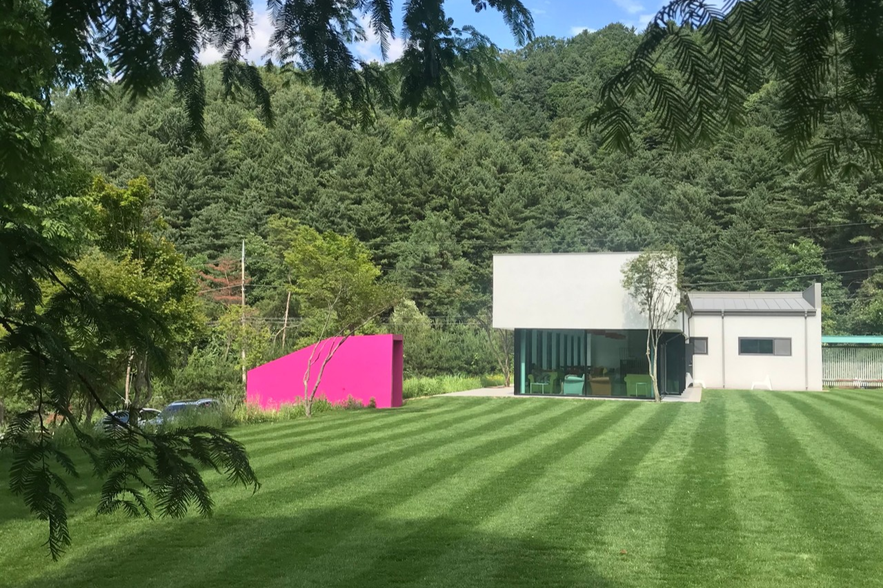 넓은 자체 주차장과 잔디 정원, 탁 트인 통유리창 산 뷰, 쾌적한 실내외 공간