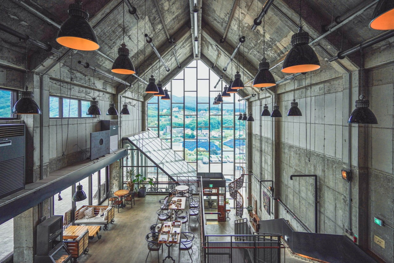 탁 트인 자연풍경과 세련된 인더스트리얼 스타일의 인테리어, 넓은 야외 테라스 카페