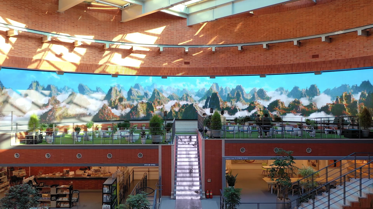 카페 공간 전체가 거대한 LED 미디어월, 바닥, 계단 등이 스크린으로 이루어져 있어, 최상층에 앉아서 커피를 즐기는 동안 초고화질(16K, 28m 규모)의 실감 나는 미디어아트 영상을 감상