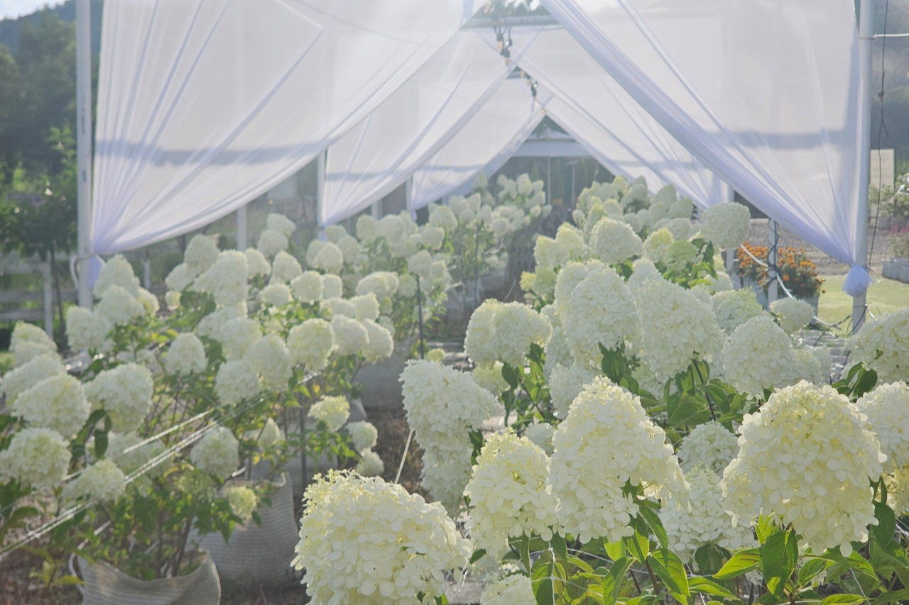 시골 외곽의 한적한 들판 한가운데에 자리한 넓은 정원형 베이커리 카페