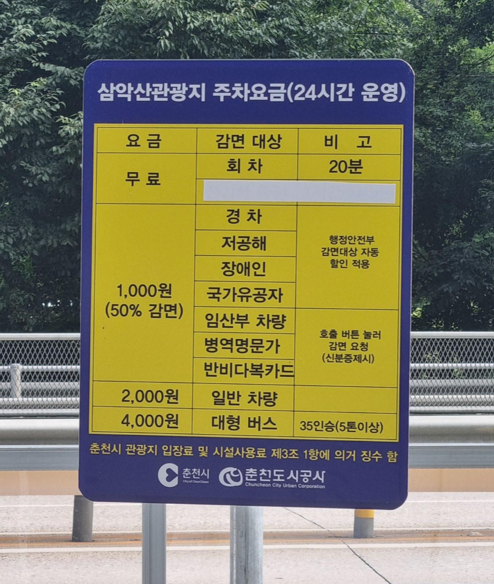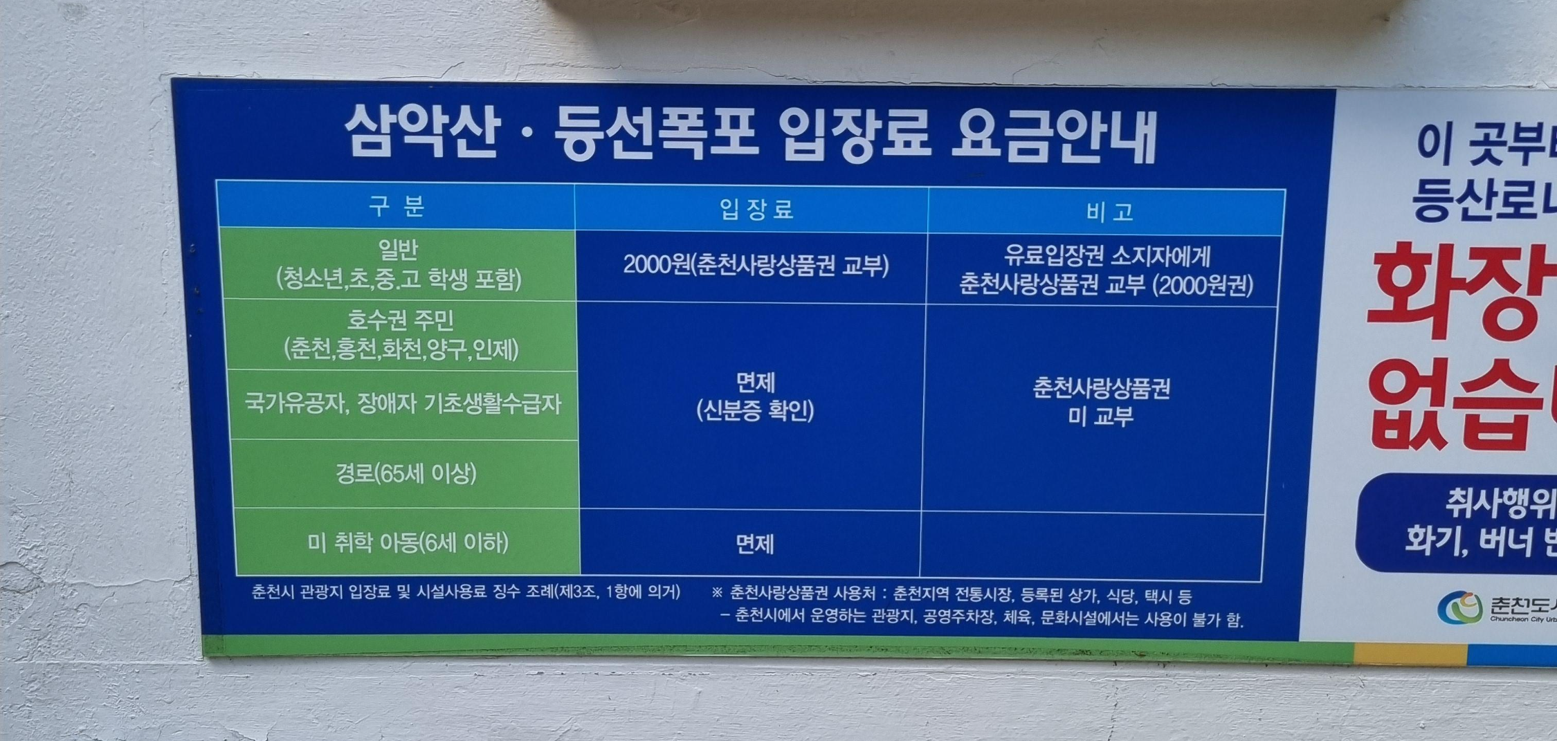 미취학 아동(7세 이하, 증명서 필요), 호수권 주민(춘천, 홍천 등), 경로자(만 65세 이상) 무료