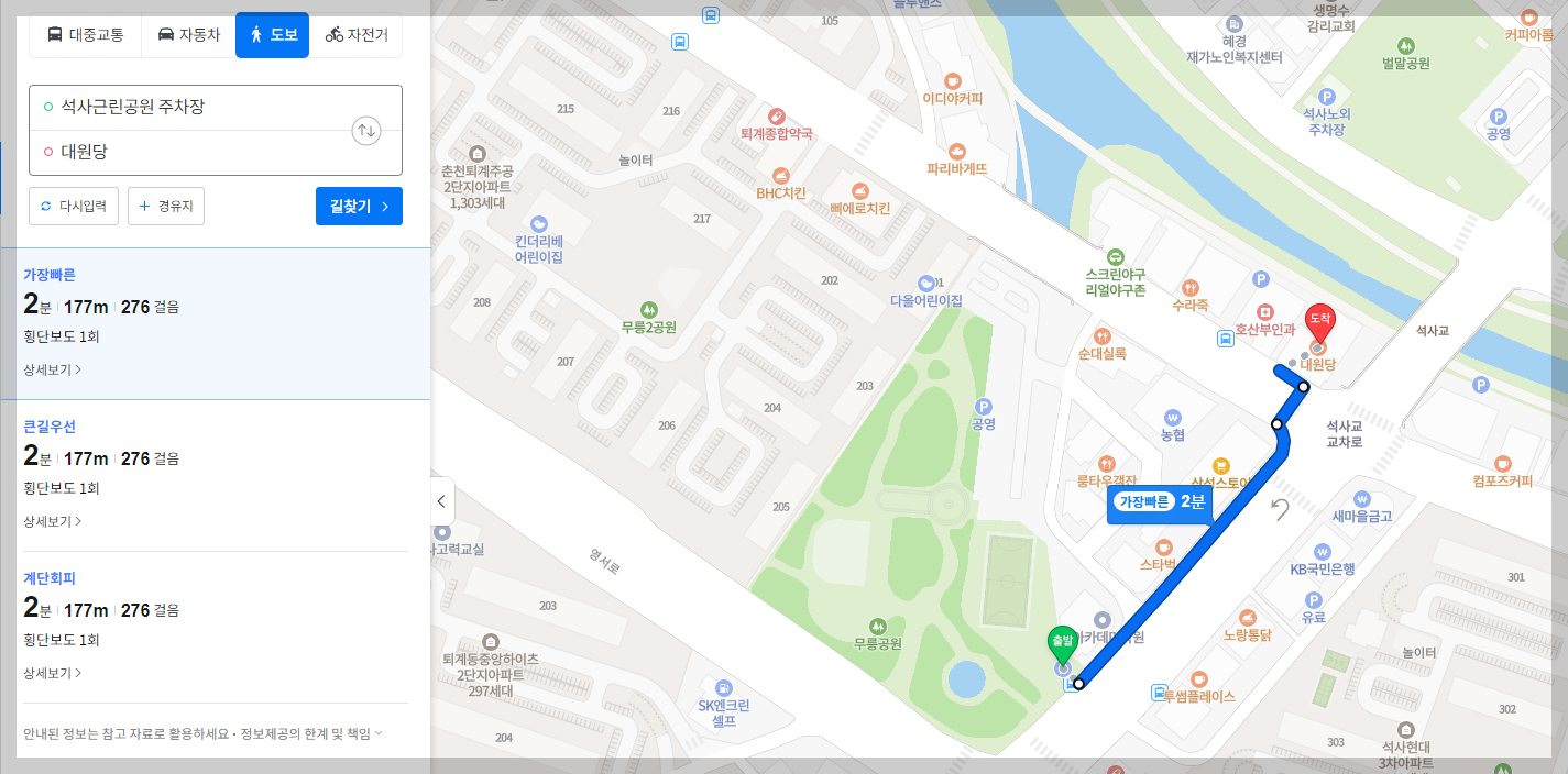 주차 대기가 길어 보인다면 도보 2분 거리에 석사근린공원 공영주차장을 이용하세요