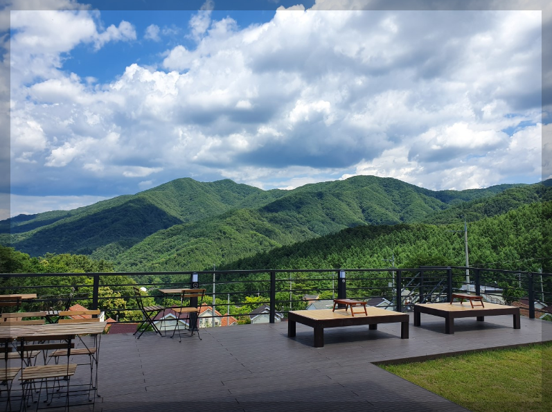 주변에 다른 카페들에 비해서 사람이 적을 것으로 예상되고, 이 마운틴뷰를 바라보며 커피 한잔하고 싶어서 정했다.