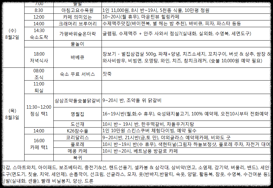 *준비물 참고 - 지갑, 스마트와치, 아이패드, 보조배터리, 충전기&선, 핸드선풍기, 셀카봉 & 삼각대, 상비약(연고, 소염제, 감기약, 버물리, 밴드), 세안도구(면도기, 칫솔, 치약, 세안제), 손톱깎이, 선크림, 선글라스, 모자, 옷(반바지, 반팔티, 속옷, 양말, 활동복, 잠옷, 수영복, 수건여분 등), 신발(실내화, 샌들), 빨래 비닐봉지, 양산, 드론, 젠가, 보드게임