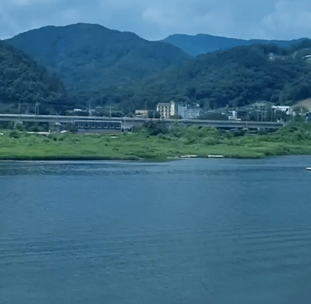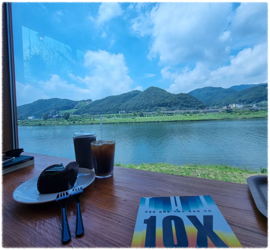 창밖으로 강물을 가르며 시원하게 달리고 있는 라이더를 보니