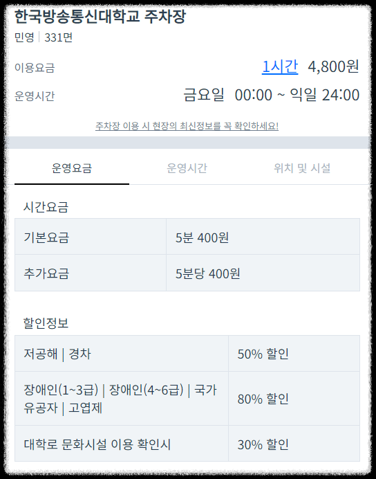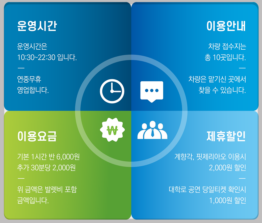 - 주차장이용요금: 기본 - 30분 3000원 / 이후 20분당 2000원 추가