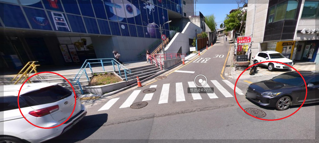 아래와 같이 횡단보도가 있는 골목길 코너 부분에 주차할 경우 주말임에도 교통 방해로 단속당할 수도 있다