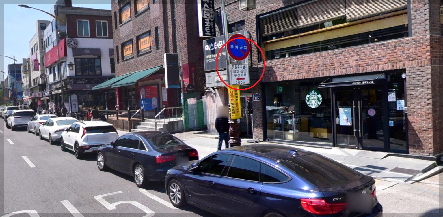 올리브영 옆에 있는 이 스타벅스부터 주차거리 시작인데 평일에는 단속을 한다는 표지판을 볼 수 있다