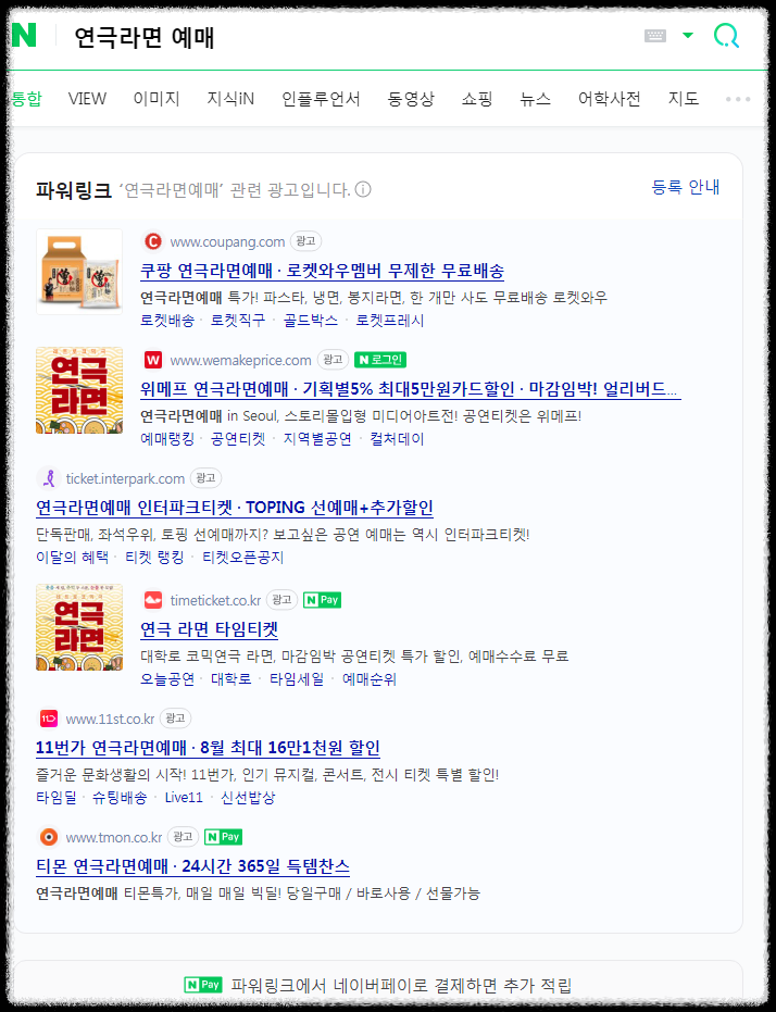 원하는 공연의 제목을 가지고 포털 사이트 검색을 통해 여러 예매처를 찾아볼 수 있다