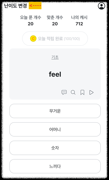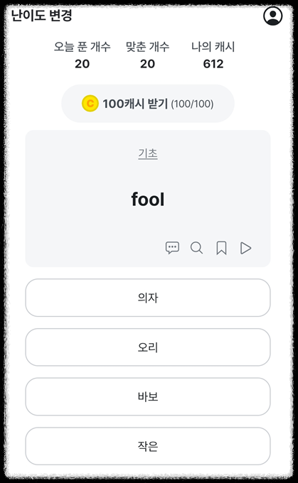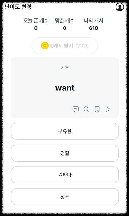 영단어 공부하면서 돈을 벌어보세요! 단어 1개를 공부할 때마다 5캐시씩 쌓여요. 캐시를 현금이나 기프티콘을 구매해 보세요. 1. 영단어 공부하면서 캐시를 모아보세요. 영단어 1개에 5캐시씩,