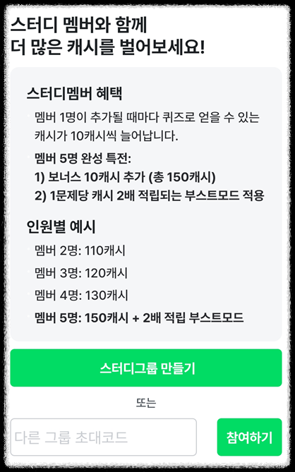 7. 스터디 그룹을 만들면 한 명당 퀴즈로 받는 캐시가 10 캐시씩 늘어나고