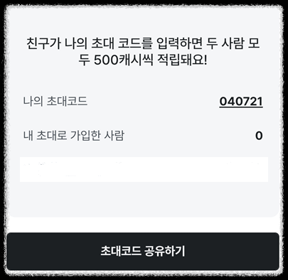 8, 마지막으로 초대코드 페이지에서 나의 초대코드를 입력해줄 경우 서로 500 캐시를 받을 수 있다!!!