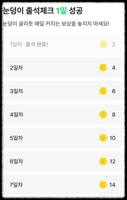 '출석체크'를 통해서 첫날 2 캐시부터 7일 차까지 하루에 2 캐시 늘어나는 캐시를 매일매일 챙겨준다