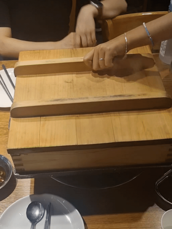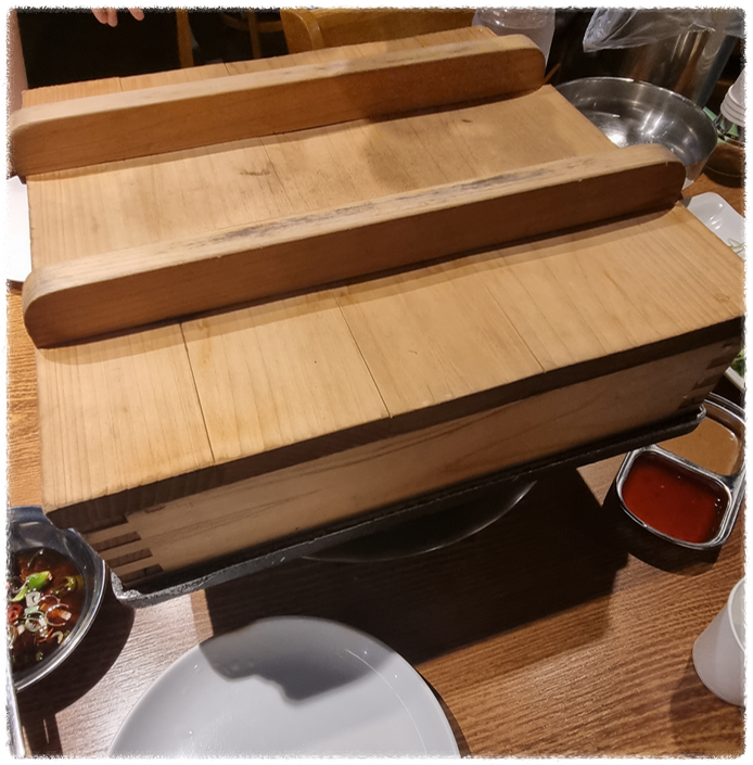 주문과 거의 바로 동시에 이렇게 편백찜과 그릇들이 세팅됩니다