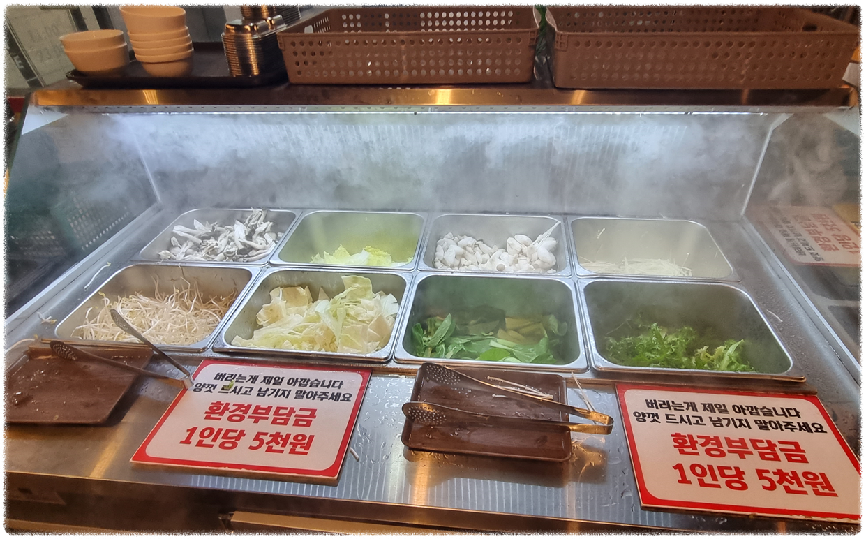 3인 이상 한 테이블에서 먹으려면 뜨거운 물과 재료들 모두 2개씩 퍼와야 했습니다
